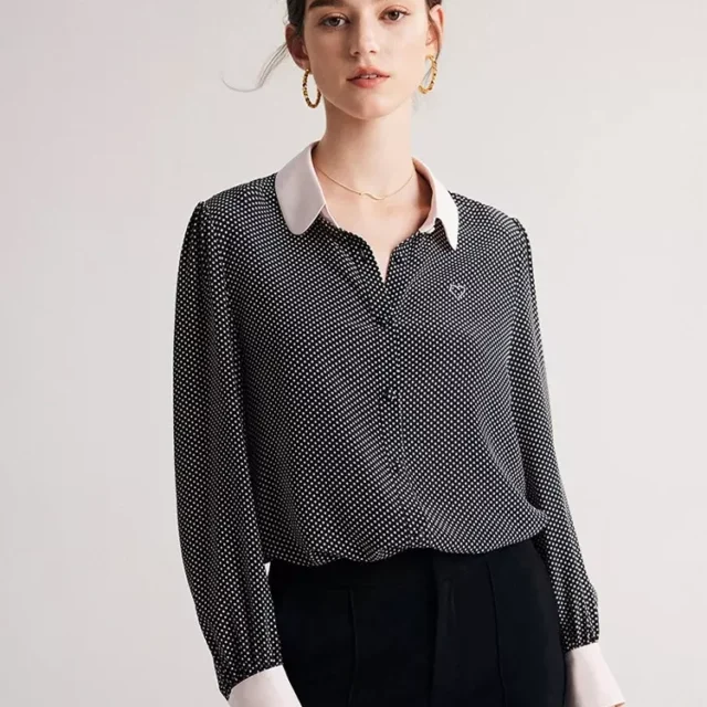 Elevate your office wardrobe with this stunning 100% silk polka dot blouse, designed for the modern woman who values sophistication and comfort. Crafted from luxurious Mulberry silk crepe de chine, this blouse offers a smooth, soft feel against the skin, making it the perfect choice for long days at the office or any occasion that calls for a touch of class. The timeless polka dot pattern adds a playful yet professional touch, while the single-breasted closure and turn-down collar provide a refined look that’s ideal for the workplace or after-work events.