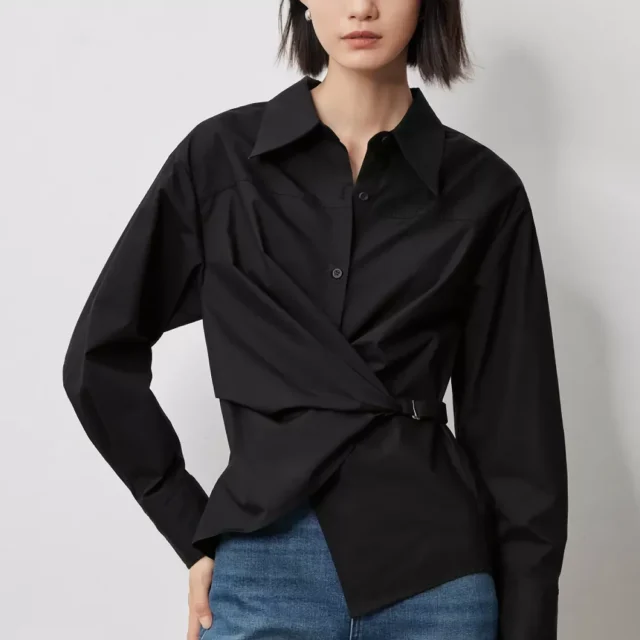 Introducing the perfect addition to your autumn wardrobe – the Twisted Tie Waist Long Sleeve Blouse. Designed with both style and comfort in mind, this blouse is a must-have for the modern woman. Crafted from a blend of cotton and polyester, it offers a midweight feel that’s ideal for the cooler seasons. The solid color design and turn-down collar add a touch of sophistication, making it a versatile piece for various occasions.