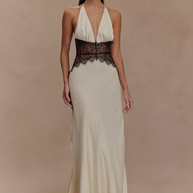 With its deep V-neckline, delicate patchwork lace, and high waist cut, this dress is made to flatter. The halter neck style not only adds a touch of vintage glam but also enhances your shoulders and neckline. The soft knit fabric blend of polyester and spandex offers a slight stretch, giving you comfort without compromising style. Its sleeveless, airy design makes it ideal for warm-weather occasions — from sunset cocktails to moonlit strolls.