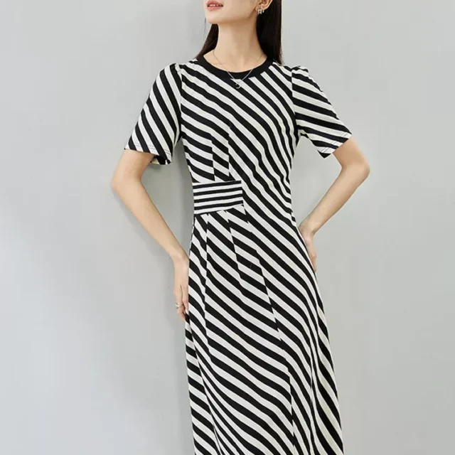 Step into summer with this chic black and white striped midi dress, designed for timeless elegance and all-day comfort. With its classic round neckline, short sleeves, and flattering A-line silhouette, this dress is a perfect blend of sophistication and ease. The eye-catching striped patchwork design adds a modern touch, making it a standout piece in your wardrobe. Whether you’re heading to brunch, running errands, or enjoying a casual evening out, this dress keeps you looking stylish and feeling comfortable.