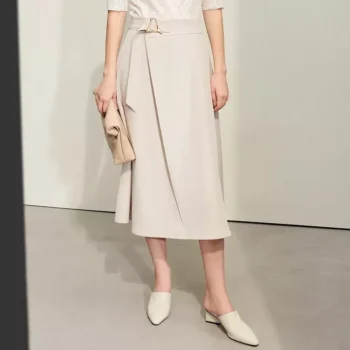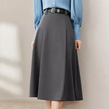 Elegant Gray Pleated A-Line Midi Skirt with Belt for Women – Spring Summer