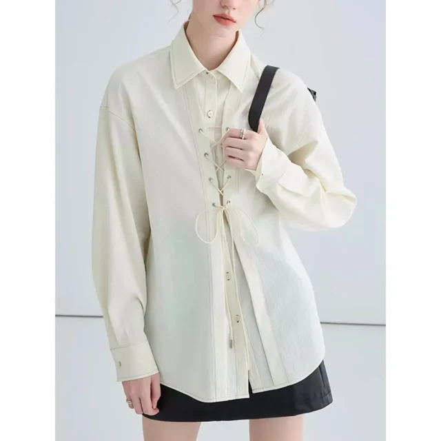 What sets this blouse apart is its blend of functionality and fashion. While the polyester fabric ensures durability and ease of care (no stretching!), the elegant lace-up detail adds a touch of uniqueness not commonly found in casual shirts. This design element transforms an ordinary white blouse into a statement piece that’s both trendy and chic.