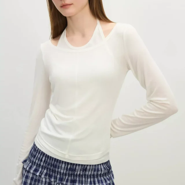 Step into summer with confidence and style in this chic halter neckline long sleeve tee. Designed with a unique fake two-piece look, this top blends a refined, office-appropriate silhouette with modern flair. Its slim fit gently hugs your shape, creating a flattering outline that’s perfect for both professional and casual settings. Whether you’re headed to a meeting or brunch with friends, this shirt brings just the right amount of polish to your wardrobe.
