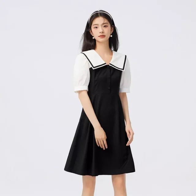 • Preppy Style & Patchwork Design – A playful take on the classic little black dress.