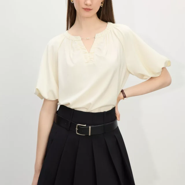 The lightweight material feels cool and breathable on the skin, perfect for hot summer days or layered under a blazer during cooler evenings. The V-neckline adds a flattering touch, while the billowy short sleeves bring in that French-inspired romantic vibe. Whether you’re dressing up for a team presentation or heading out for a relaxed brunch, this blouse fits right in with its effortless polish.