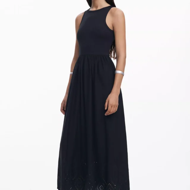 Designed by the renowned brand Desigual, this dress combines high-quality materials and expert craftsmanship. The cotton-elastane blend provides comfort that moves with you, while the simple black hue ensures this dress remains timeless. Whether you’re at a brunch or a summer festival, this dress will have you feeling confident and looking fabulous.