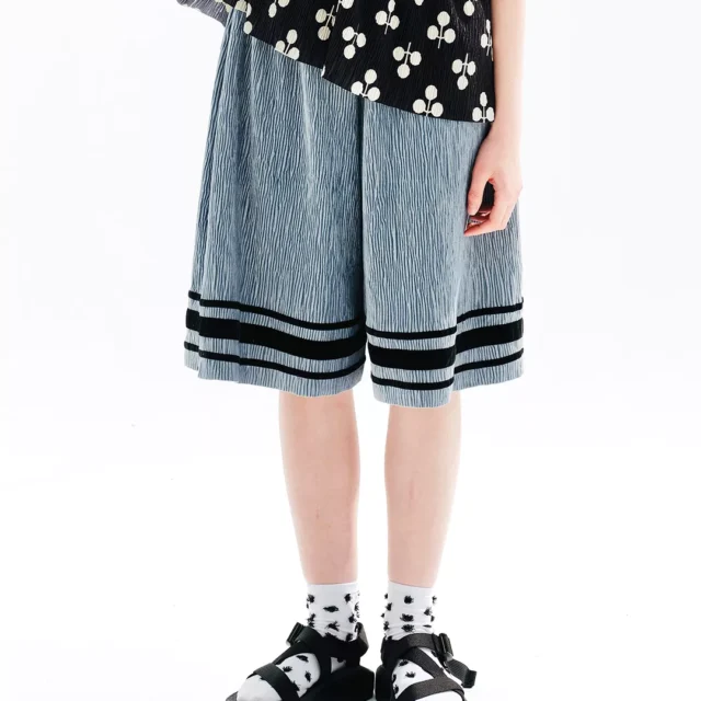 Elastic Waist Blue Striped Pleated Shorts for Women – Casual Wide Leg Style
