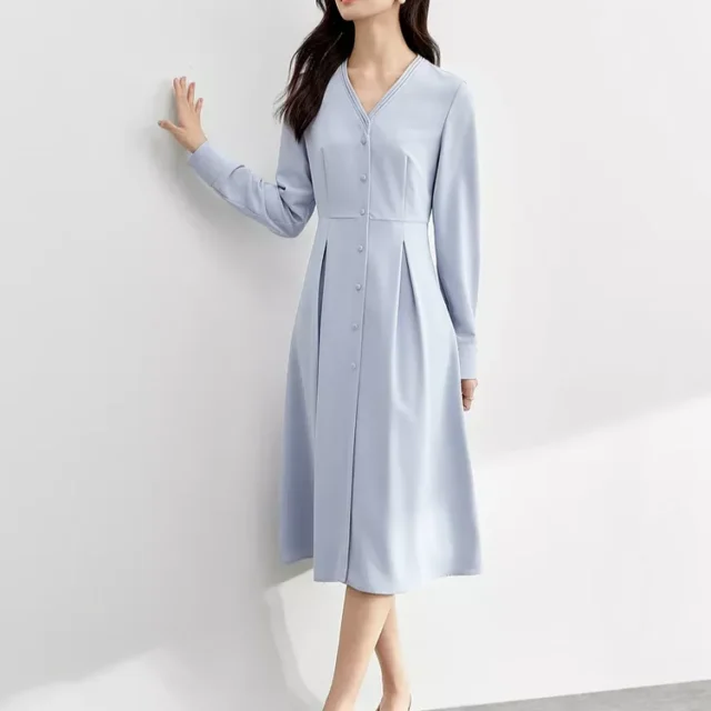 Step into effortless sophistication with this stunning A-line shirt dress, designed for modern women who value style, comfort, and versatility. Crafted in a light blue hue, this midi dress exudes grace and professionalism, making it the perfect choice for office wear, business meetings, or stylish outings. The classic V-neckline enhances your silhouette, while the long sleeves and flowing A-line fit provide a refined yet relaxed feel.