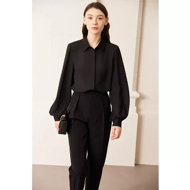 The loose fit and lantern sleeves offer a relaxed yet refined silhouette, while the turn-down collar adds a classic touch. This blouse’s midweight fabric makes it perfect for spring layering or wearing on its own. With no additional decoration, it maintains a clean, minimalist look that highlights its elegant design.