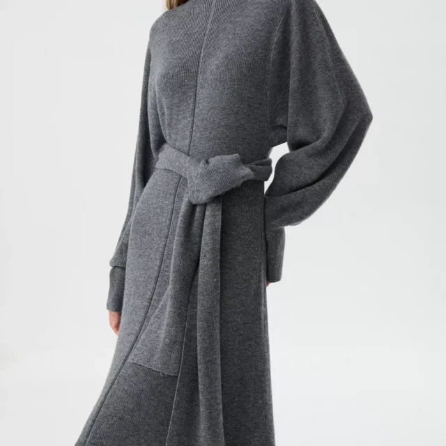 Elegant Grey Half-High Neck Wool Knit Dress with Batwing Sleeves for Winter