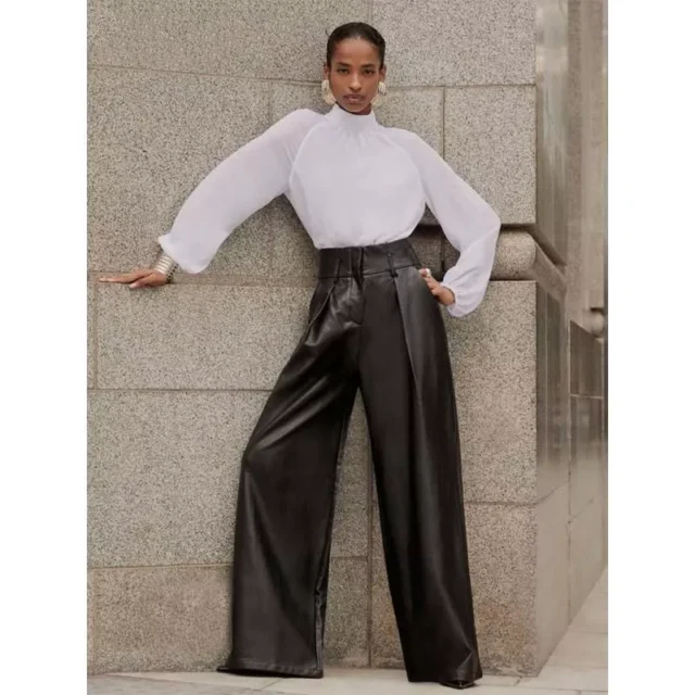 Elegant High-Waist Wide-Leg Black Faux Leather Pants for Women