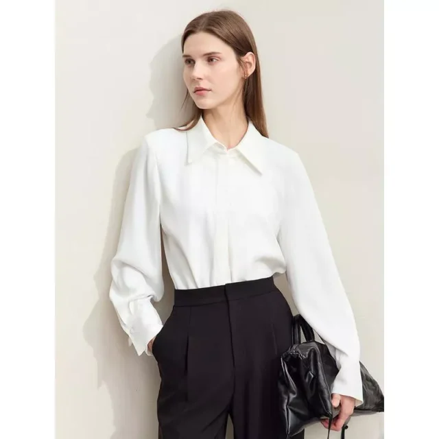 The blouse’s midweight construction makes it versatile enough for any season, while the full-length sleeves and turn-down collar contribute to its sophisticated charm. The covered button closure adds an elegant touch without disrupting the clean lines of the design. Whether you’re dressing up for a meeting or going for a laid-back look, this blouse effortlessly adapts to your needs.