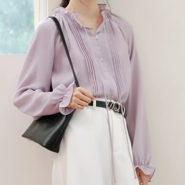 Elevate your wardrobe with this elegant purple chiffon blouse, a perfect fusion of French style and modern sophistication. Designed for women who love timeless fashion, this long-sleeved top features a delicate lotus leaf collar that exudes charm and femininity. Its lightweight chiffon fabric ensures you stay comfortable while looking effortlessly chic, making it an ideal choice for work, casual outings, or special occasions. Whether paired with tailored trousers or a flowing skirt, this blouse is a versatile addition to your closet.