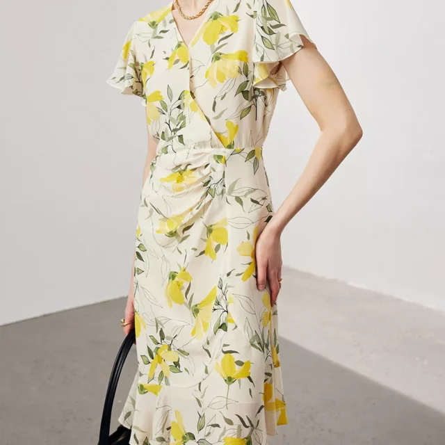 Designed with a classic floral print in soft yellow tones, this dress captures the essence of summer. The non-stretch silk fabric gives it an elegant drape, making it ideal for office wear, summer vacations, or evening outings. Whether paired with a tailored blazer for a professional look or worn alone with statement accessories, this dress adapts beautifully to any setting.