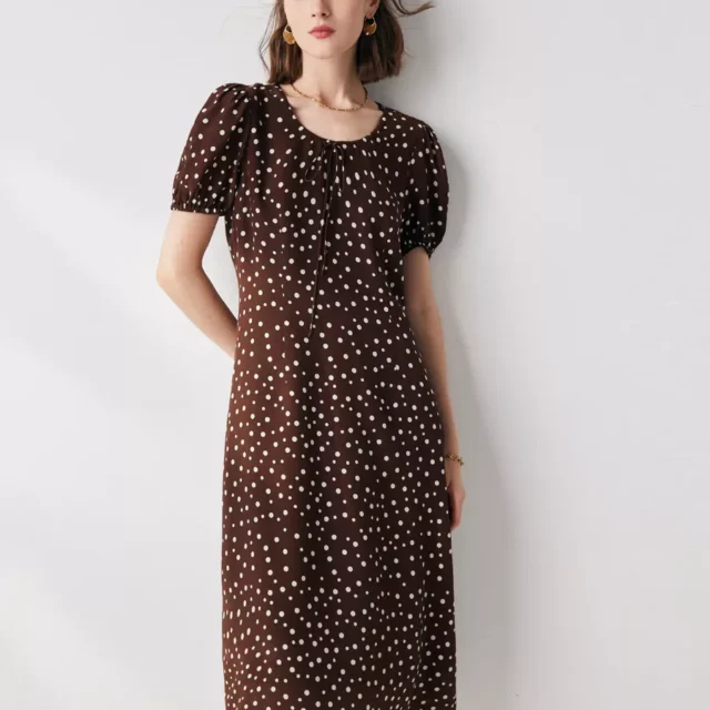 Step into sophistication with this elegant polka dot silk dress, designed for the modern woman who values comfort and timeless style. Made from 100% mulberry silk, this luxurious crepe dress drapes beautifully, offering a soft, breathable feel that keeps you cool and comfortable during the warmer months. The classic A-line silhouette flatters every figure, while the empire waistline enhances your natural shape. Whether you’re heading to the office, a brunch date, or an evening event, this dress is your go-to for effortless elegance.