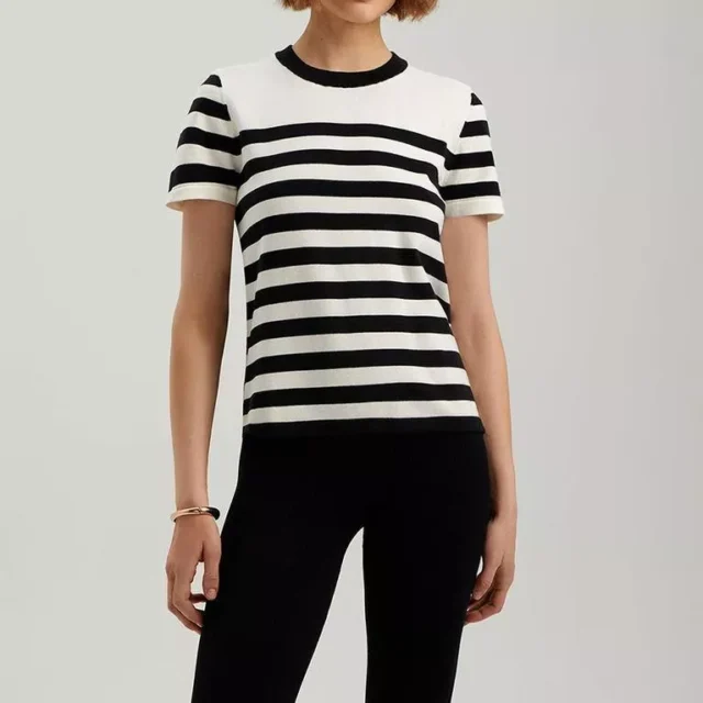 Our Striped Knit T-Shirt stands out with its knitting craft that ensures durability and a high-quality finish. The combination of premium materials and the classic stripe pattern provides a chic look that never goes out of style. Additionally, the top’s tailored fit is designed to flatter your figure while providing ease and freedom of movement.