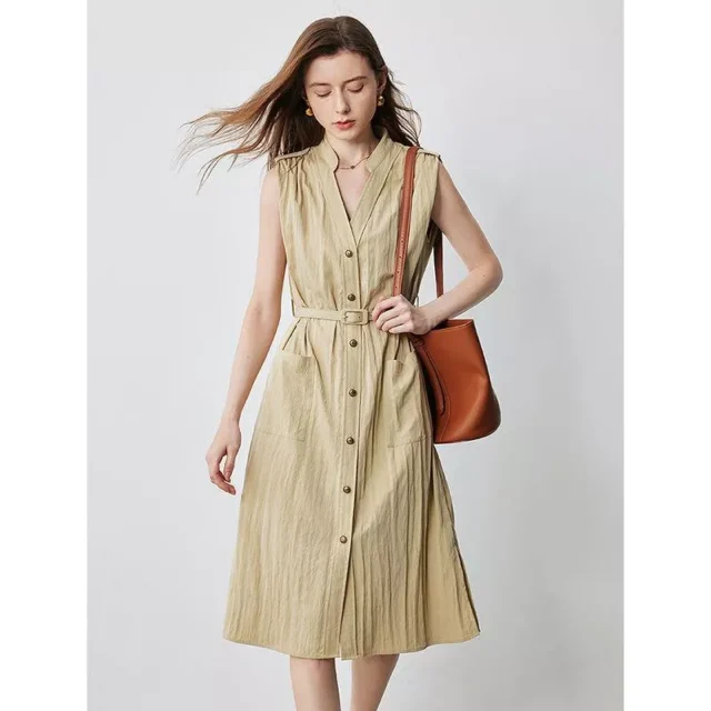 Step into summer with elegance and ease in our Sleeveless V-Neck Midi Shirt Dress. Designed for the modern woman who values style and comfort, this dress is perfect for both office and weekend wear. Its loose silhouette and mid-calf length offer a chic, flowing look that flatters any body type.
