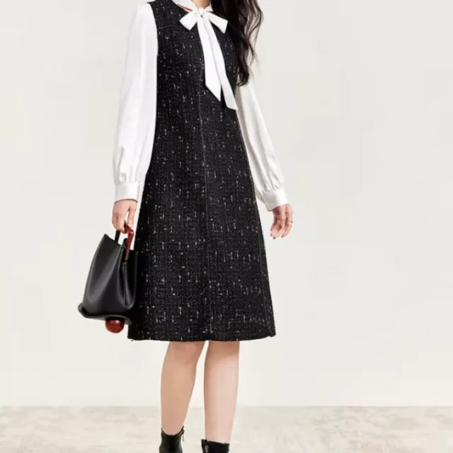 This dress is the perfect addition to your wardrobe for any season. Its tweed material provides warmth during autumn and winter while remaining breathable for indoor settings. Whether you’re heading to a corporate event, an elegant dinner, or a special occasion, this dress ensures you stand out in style.
