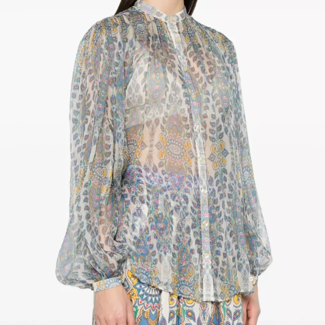 The Etro Paisley Print Blouse is more than just a piece of clothing; it’s a statement of taste and individuality. Its semi-sheer fabric offers subtle allure, making it perfect for date nights or special gatherings. The modern Korean collar and button-down design strike the ideal balance between trendy and timeless. Thanks to its elasticized cuffs, this blouse provides a secure yet relaxed fit, ensuring all-day comfort without compromising style. The intricate paisley pattern imbues every outfit with a sense of artistry and personality.