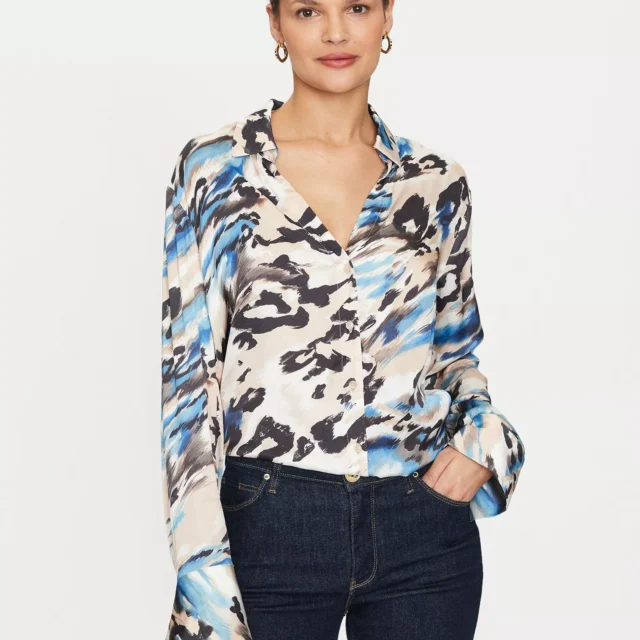 Featuring a beautiful beige tone that complements any skin tone, this blouse embodies effortless style. Its classic button-up design and long sleeves make it a season-perfect choice for the cooler months. The soft viscose fabric ensures a lightweight feel while providing an elegant drape. The addition of a classic collar enhances its structured look, making it suitable for both casual and formal occasions.