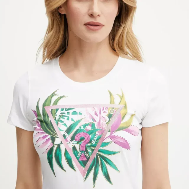 Introducing the Guess Women’s Pink Print T-Shirt, the perfect combination of comfort, style, and versatility. Designed for the modern woman, this t-shirt features a bold print in a lovely pink hue, making it an essential addition to your wardrobe. Whether you’re heading out for a casual outing, enjoying a sunny day, or looking for a comfy yet fashionable option for the season, this t-shirt has got you covered.