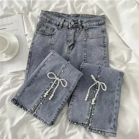 High Waist Flare Pearl Jeans – Slim Fit Ankle-Length Bell Bottoms