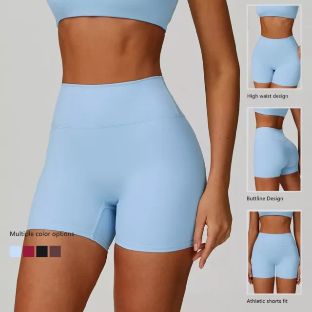 Made from a premium blend of 78% nylon and 22% spandex, the fabric feels soft against the skin while offering excellent stretch and moisture-wicking capabilities. The high waistband smooths your silhouette and stays in place, giving you the freedom to move without distractions. With a sleek, solid-color design available in black, wine red, brown, and sky blue, these shorts blend seamlessly into your workout or casual wardrobe.