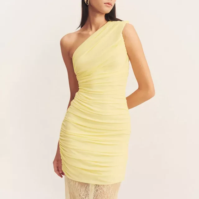 Crafted from a soft polyester-spandex blend, this dress moves with your body, providing slight stretch for comfort while maintaining a structured fit. The diagonal neckline creates an asymmetrical statement that draws attention to the shoulders and collarbone, while the sleeveless cut enhances freedom of movement. The backless design paired with lace patchwork adds a hint of mystery and femininity that elevates your style instantly.
