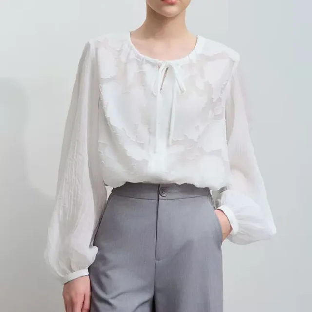Designed with the modern woman in mind, this blouse is the perfect balance between comfort and elegance. The breathable chiffon fabric allows for all-day wear, while the lantern sleeves offer a flattering, feminine silhouette. The O-neck collar provides a classic, refined look, while the shirring and drawstring details add a unique twist. This blouse is not only stylish but also practical, with its relaxed fit allowing for ease of movement.