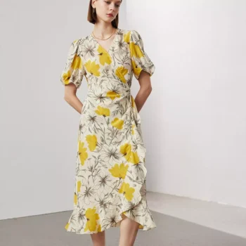Elegant Floral Silk Midi Dress with V-Neck & Ruffles