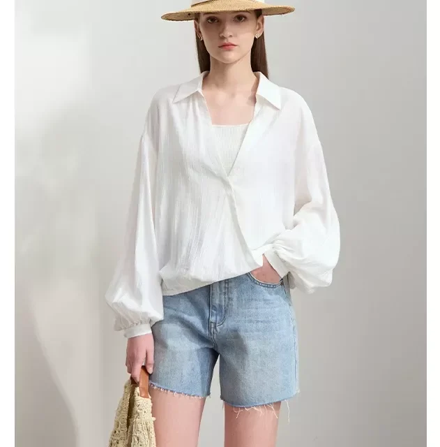 Minimalist Chiffon Blouse – Elegant V-Neck Lantern Sleeve Pleated Shirt