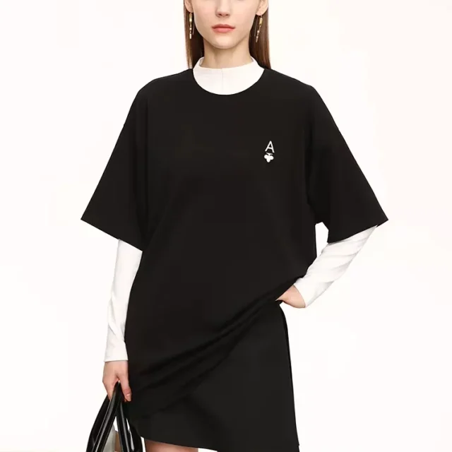 The charm of this top lies in its ability to offer a minimalist, relaxed style without sacrificing elegance. The small embroidered details give it a subtle yet sophisticated touch, while the medium-long cut and drop shoulder sleeves create a flattering and comfortable fit. The fabric blend of polyester, cotton, and spandex ensures the perfect balance of breathability, stretch, and durability. This makes it not only a stylish option but also an incredibly practical one for everyday wear.