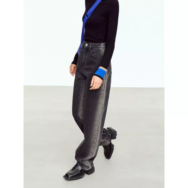 These jeans combine the best of retro aesthetics and modern comfort. The non-stretch cotton denim provides a structured look while maintaining comfort, and the unique distressed wash adds character. The mid-rise waist and wide-leg cut create a flattering silhouette that complements various body types, making these jeans a must-have for any fashion-forward woman.