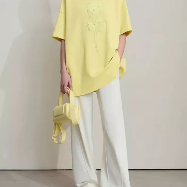 This versatile t-shirt is ideal for various occasions, from casual outings to office wear. It’s designed to transition easily from day to night, so you can wear it to work, a lunch date, or a shopping trip. The subtle floral embroidery gives it an elevated, feminine touch, making it perfect for spring and summer months. The breathable fabric ensures comfort during warmer weather, while the longer length adds sophistication to your look. Pair it with jeans, skirts, or trousers for an effortlessly stylish outfit every time.