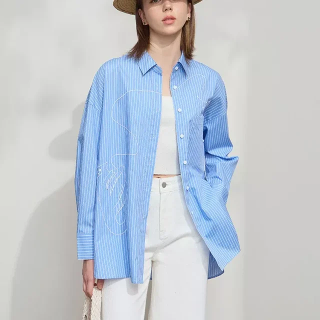 Minimalist Women’s Cotton Striped Blouse – Casual Lapel Shirt with Embroidery