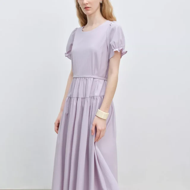 Crafted from a breathable blend of polyester, nylon, and spandex, the fabric offers a slight stretch that moves with you while maintaining a flattering shape. The adjustable waistline ensures a custom fit, accentuating your silhouette while staying relaxed and comfortable. Its puff sleeves add a gentle feminine touch, while the classic O-neck and A-line silhouette keep the look refined and versatile.