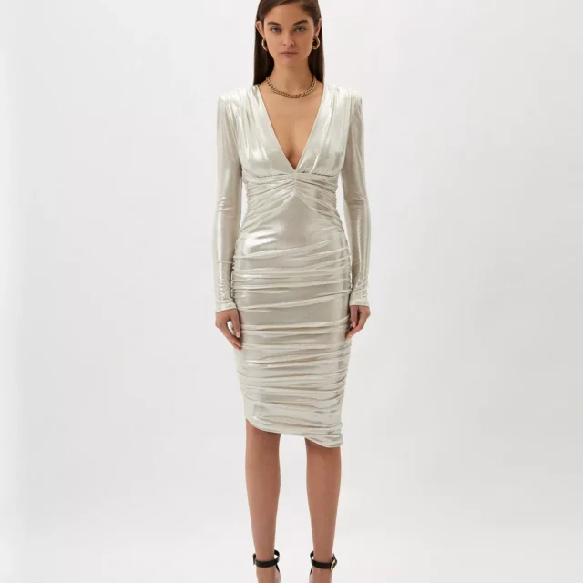 Crafted in a crisp plain white with a subtle sheen, this dress from Pinko is all about refined simplicity. The deep V-neckline adds a hint of allure while the long sleeves balance the look, offering a flattering silhouette for all body shapes. A discreet back zip closure keeps the fit sleek and streamlined. Its lightweight feel and just the right touch of stretch ensure you move comfortably through your day.