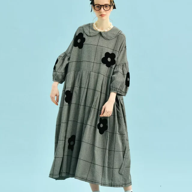 Featuring a round neckline with a classic Peter Pan collar, this dress gives off a distinctly nostalgic charm, while the plaid pattern adds a timeless touch. The three-quarter puff sleeves add structure and softness, offering just the right amount of coverage for breezy spring and summer days. Designed with a natural waistline and slight stretch, it provides a flattering yet relaxed fit that moves with you effortlessly.
