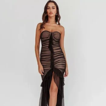 Mozision Strapless Mesh Lace Bodycon Midi Dress