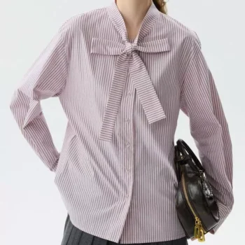 Women’s Blue and White Stripe Bow Collar Cotton Long Sleeve Blouse