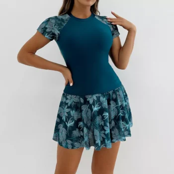 Women’s High Waist 2-Piece Tankini with Skirt – Short Sleeve Swimsuit Set