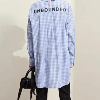 Beaded Embroidery Plaid Cotton Blouse with Tie – Loose Fit Long Shirt