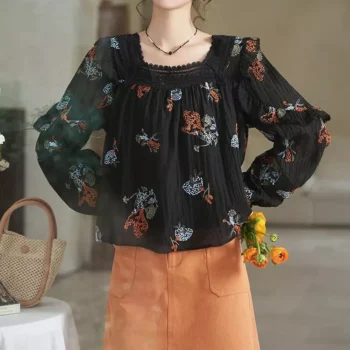 Korean Embroidered Dandelion Blouse with Lace Square Neck
