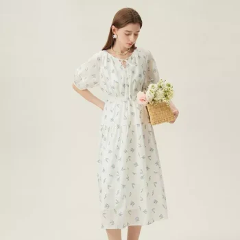 Summer Floral Embroidery Midi Dress with Lantern Sleeves for Women