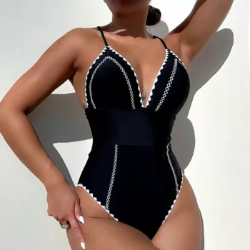 Sexy Black Deep V One-Piece Swimsuit for Women – High Waist Summer Swimwear