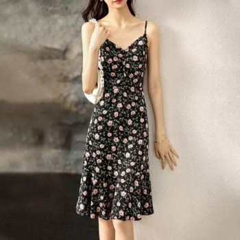Elegant Floral Spaghetti Strap Midi Dress – V-Neck A-Line Swing Dress