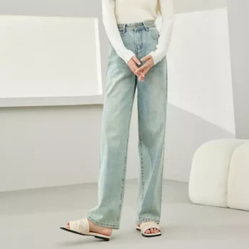 High Waist Wide Leg Denim Pants for Women – Retro Light Blue Casual Trousers
