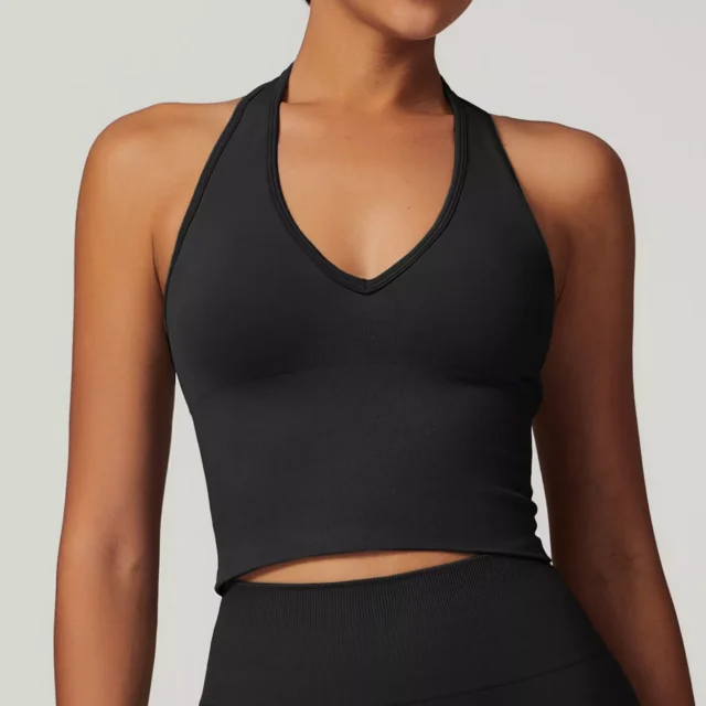 Seamless Open Back Sports Bra – Workout Crop Top with Neck Strap Support