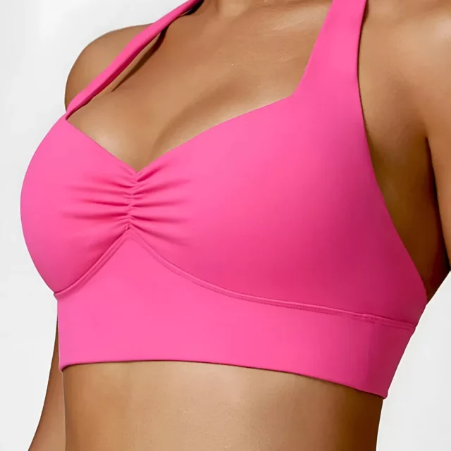 This bra isn’t just about looks – it’s built to perform. The halter neckline gives a lifted and sculpted silhouette, while the ruched front adds a touch of femininity. The built-in padding and corset-inspired design offer a natural push-up effect that supports and shapes without sacrificing movement. Crafted with a premium blend of 78% nylon and 22% spandex, the fabric is ultra-stretchy, breathable, and moisture-wicking – perfect for even the most intense workouts.
