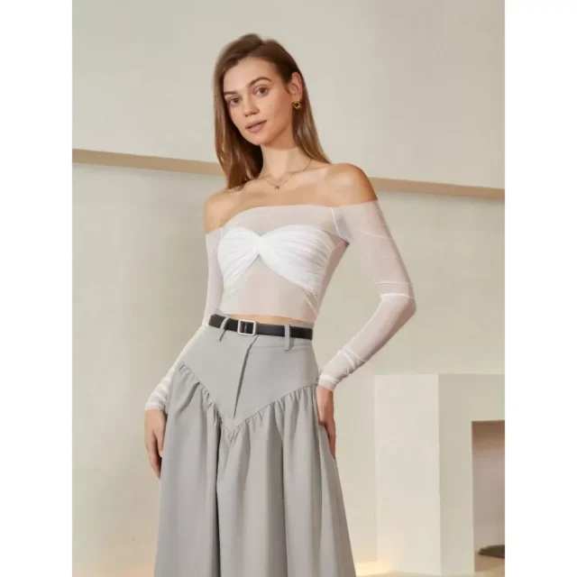 • Design: Unique off-shoulder style with an eye-catching twist front and a subtly ruched sheer fabric that adds a touch of mystery.